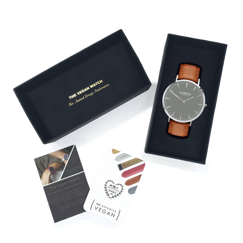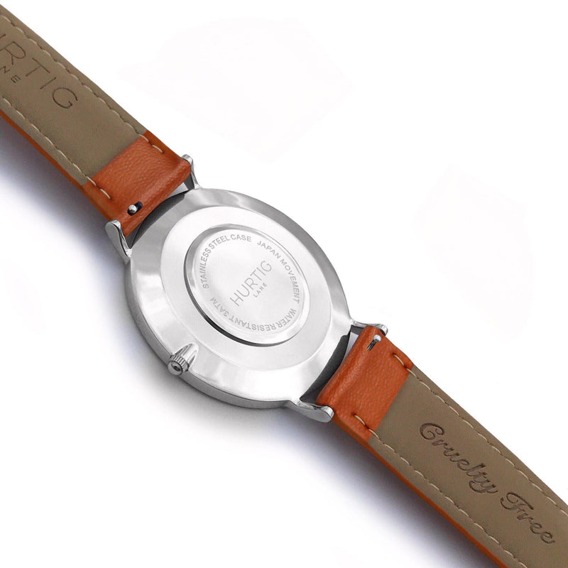 The original vegan watch collection for women. The Mykonos cruelty-free range was designed for the fashion conscious minimalist. Elegant and sophisticated yet highly fashionable this timepiece can be worn in any setting, with any outfit. Its versatility and style make it the perfect watch for any occasion. We are passionate about animal welfare and the planet which is why none of our products will ever contain animal products and we always try to use sustainable materials in both our products and our packaging. Hurtig Lane's vegan leather watch straps are made from cotton fibres and recycled water bottles. Our straps are strong, durable and truly ethical. Our straps are not only beautiful but they are built to last! You won't find plastic in any of our packagings and all of our products are presented in beautiful pouches or boxes, making them perfect for gifting. Our collection of watches come in a huge range of colours with interchangeable straps. Mix & match different straps with your timepiece, so that you can always perfectly pair your outfit and accessories!  Our watch bands are branded with our cruelty-free logo, so you can be proud of your ethical, kind & sustainable purchase.